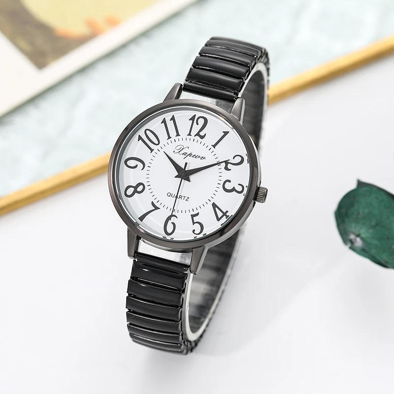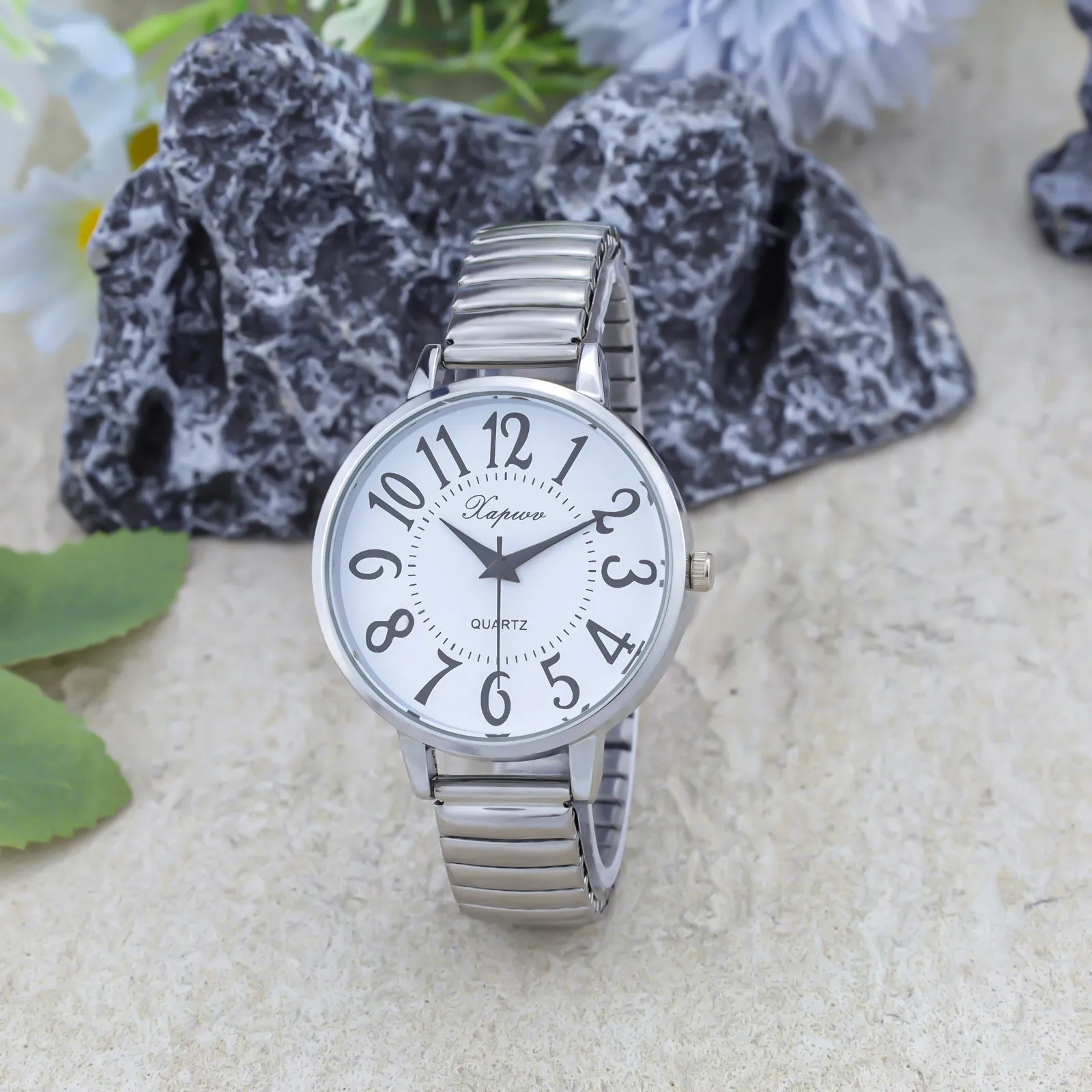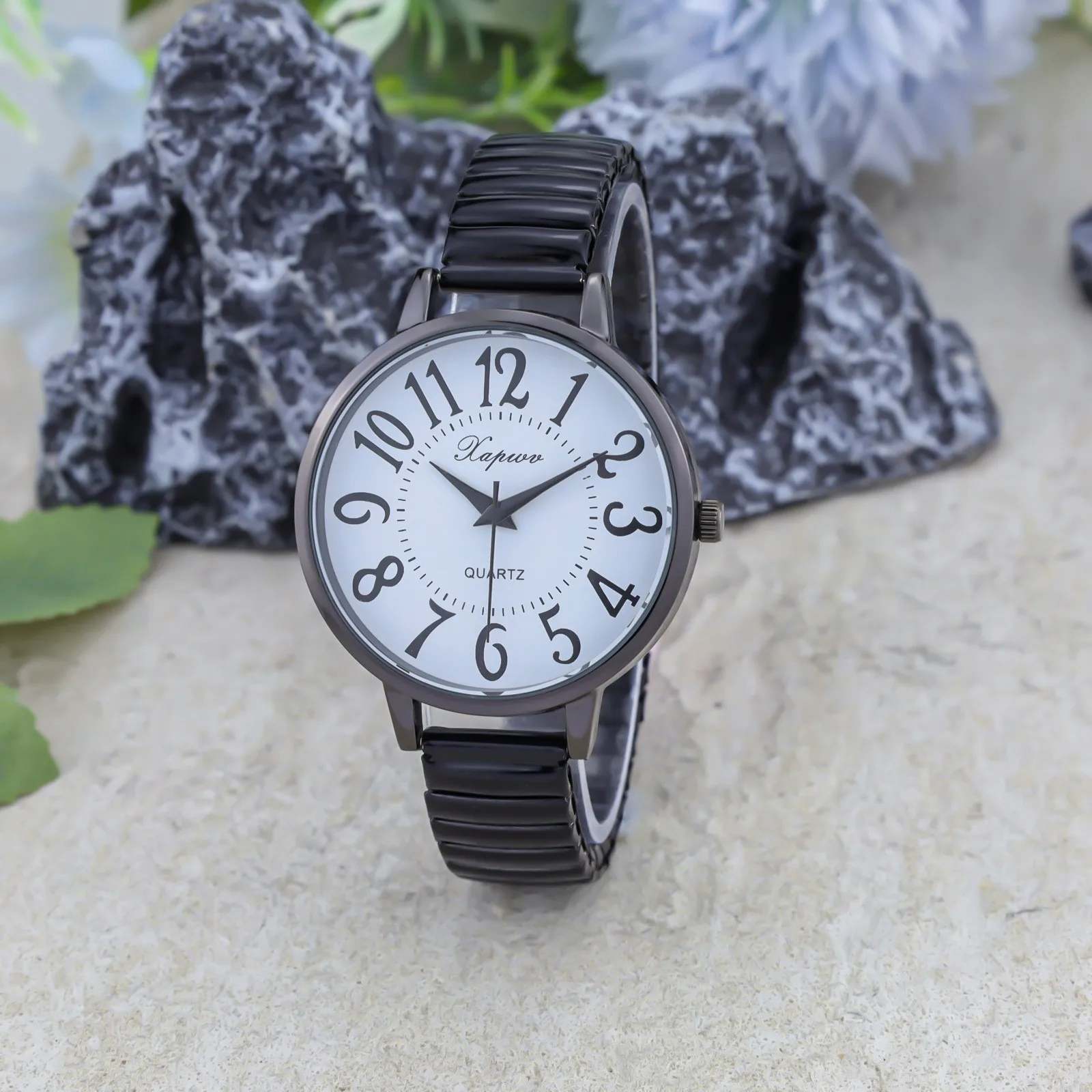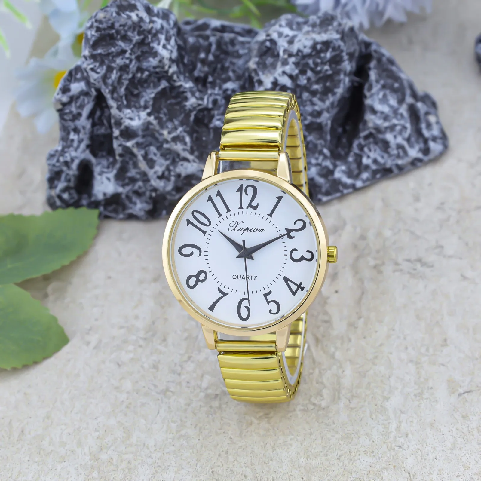 ساعة نسائية أنيقة وعصرية تعمل بالكوارتز، بأرقام عربية كبيرة وسوار مطاطي، بتصميم كلاسيكي مناسب لكبار السن، هدية مثالية لهم.